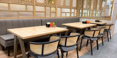 Restaurant seating, hotel furnishings, and commercial-grade pieces tailored for high-traffic use.
