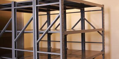 Racks with extended arms designed to store long, bulky items like lumber, pipes, or steel.