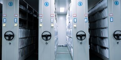 Movable racking units on rails that maximize storage by eliminating fixed aisles.